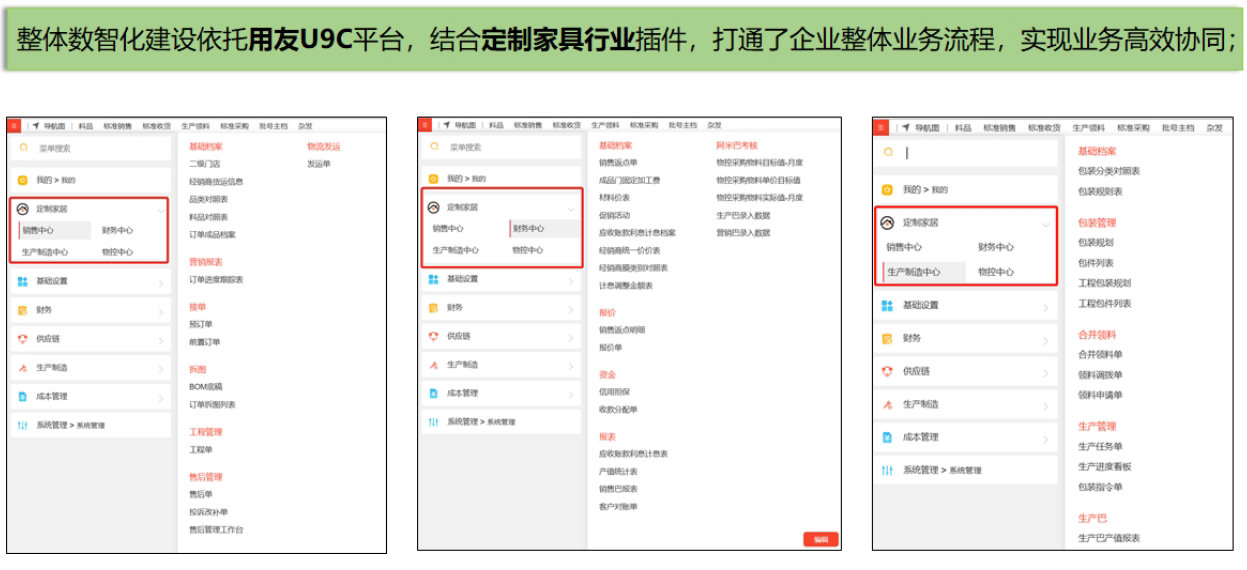 针对新材料和定制家居行业的特殊业务需求及其管理难题,依托U9 cloud产品平台的强大功能,专门开发了一套完整的行业插件,专为满足定制家居行业的独特要求。
