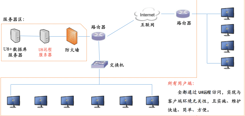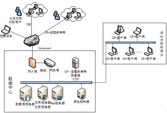 异地有分支机构需要远程使用U8+客户端,或者并发人数少为了减少U8+客户端维护工作量也可以采用U8远程接入。