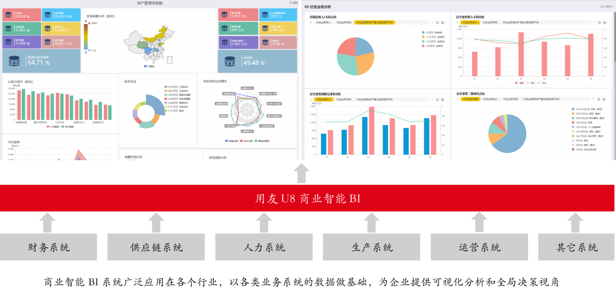 用友U8+ BI是一套完整的由数据仓库、查询报表、数据分析等组成的数据类技术解决方案,其核心目的在于打通企业内部各种繁杂的业务系统,通过数据清洗、整合、加工、建模,最终通过可视化的方式为企业提供决策支持。