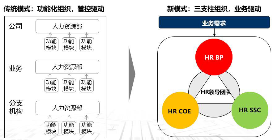 为了适应新的业务发展,响应业务需求,人力资源管理会从原来的职能化组织、管控驱动向新模式,三支柱组织、业务驱动转变,三支柱即HRBP(业务人员)、COE(专家)、SSC(共享中心)