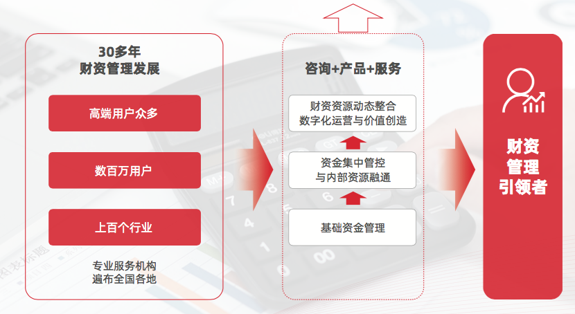 用友财资管理从满足最初的现金管理、票据台账、银行对账等基础资金管理职能,到银企互联技术变革下的资金集中管控与内部资源融通,再到如今面向数智企业的财资资源动态整合、数字化运营与价值创造。助力企业整合内外部财务及金融资源,场景化服务企业经营活动,业财融合创新财资管理模式,共享协同强化资金管控体系。