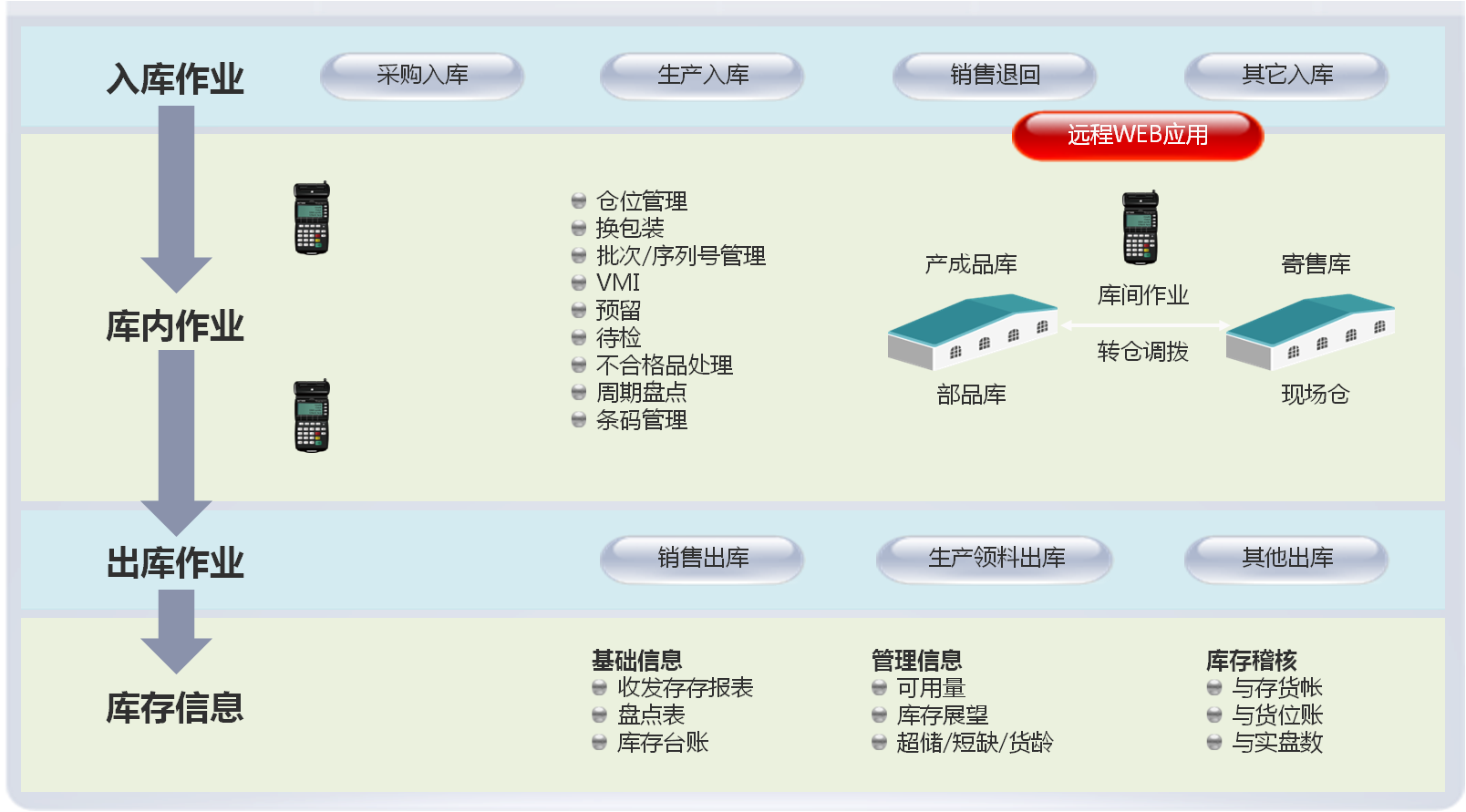电子产品的原材料,一般都有保质期要求,存放过久会对性能或外观产生影响,基于质量管理、库存控制及精益生产思想的要求,企业可通过条码手段实现库存先进先出等管理,此外对仓库包装要求,上下架、包装等可进行智能化策略管理。