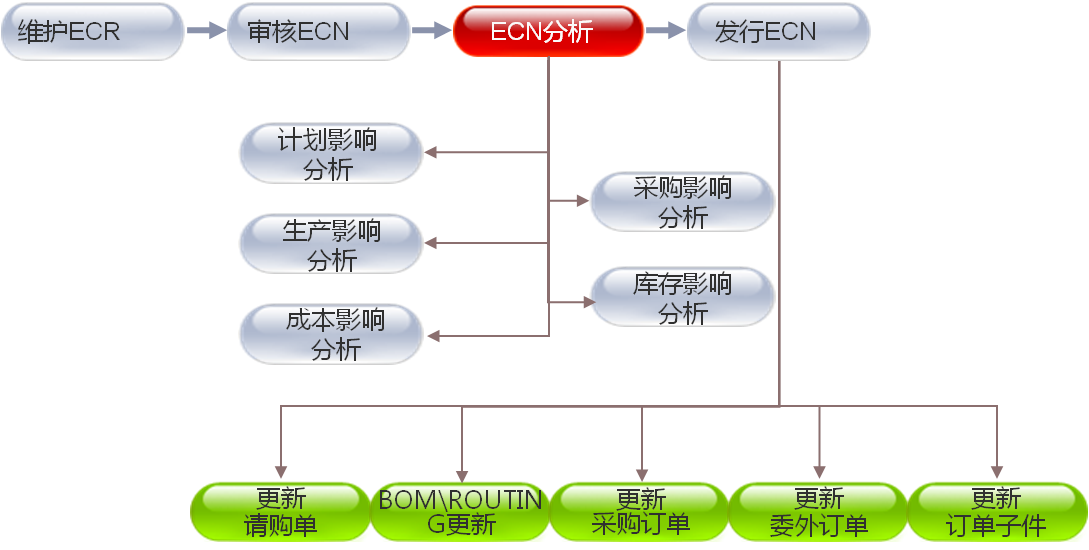 由于设计变更或者客户的需求发生变化,普遍存在原材料发生变化的情况,针对上述情况,ECN影响处理对发生变更的生产订单、委外订单、请沟单、采购单进行了处理建议及变更后的追溯。