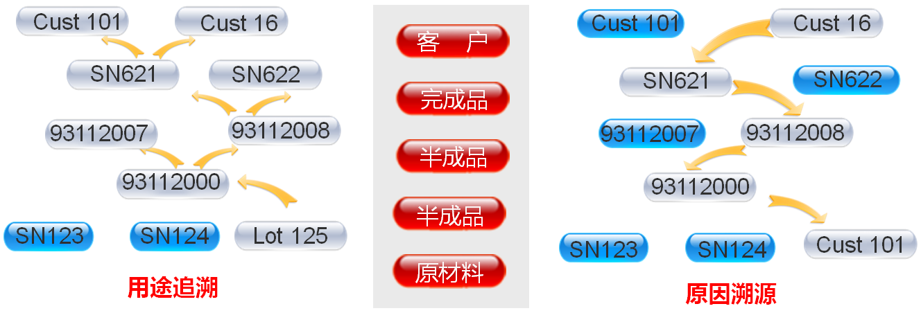 电子产品往往对产品质量控制及质量追溯性要求较高,需要构建完善的产品履历,追溯到对应的人、机、料等,即溯源和去向的查询,便于产品质量分析和产品质量事故召回。