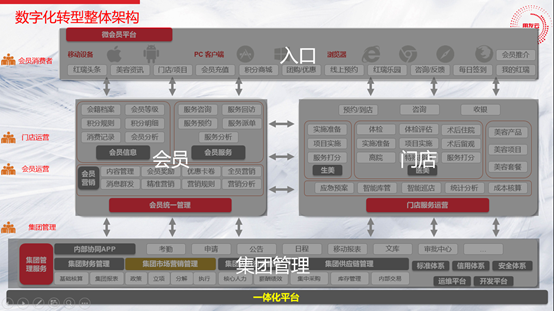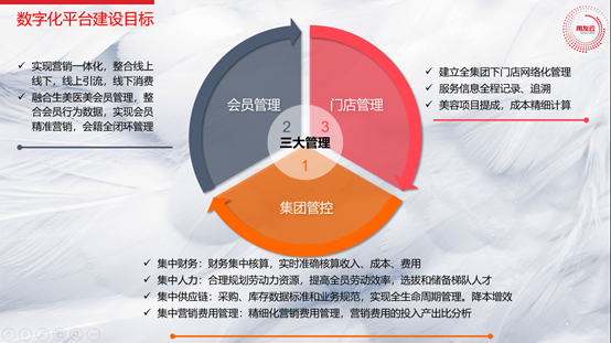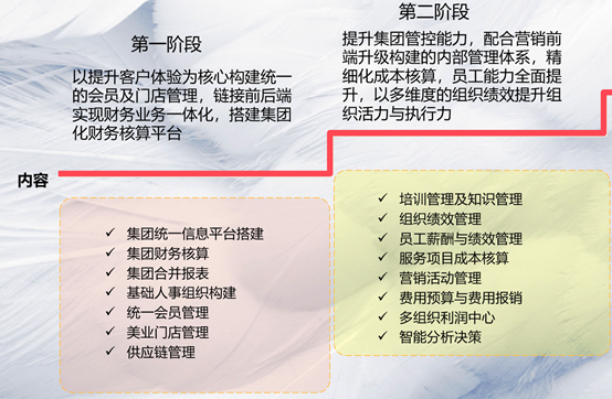 建设集团统一信息平台,建立统一、标准的数字化平台;并在整体的数字化平台基础上,建设集团财务核算管理、报表管理、供应链管理、人力资源管理、统一会员管理、美业门店管理系统。实现信息平台统一化,会员门店融合化,财务核算自动化,业务财务一体化,实现整体数字化规划的第一个“四化”建设。