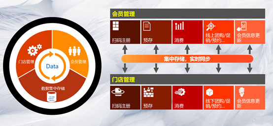 会员扫码注册、预存金额、实际消费、线上团购、促销、预约等等,会员管理系统与门店管理系统进行实时数据融合,保证数据的集中存储,实时同步。
