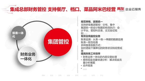 集成总部供应链 智能要货 库存平衡 集中采购 物流统配,集成总部财务管控 支持餐厅、档口、菜品阿米巴经营
