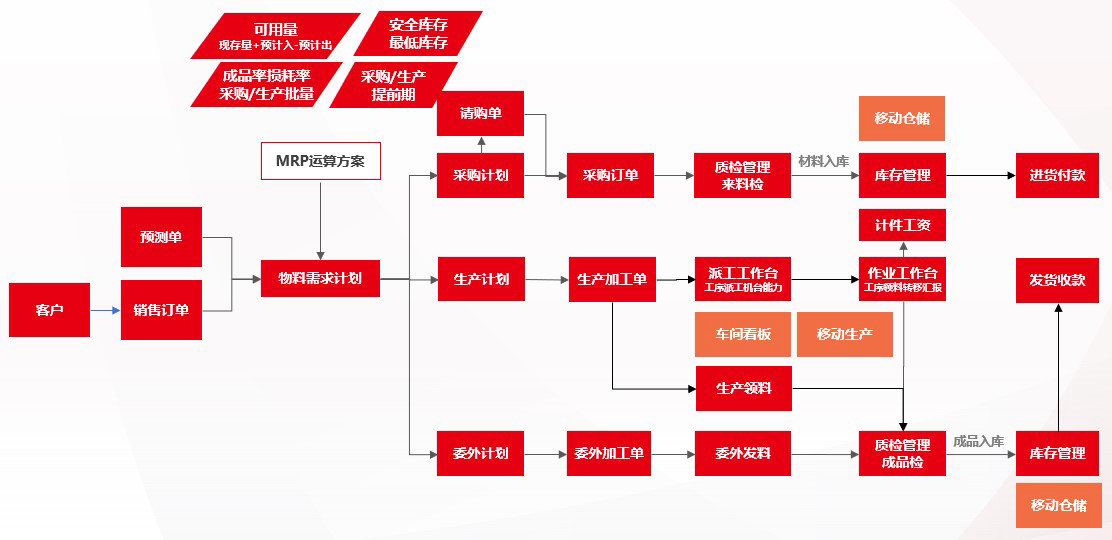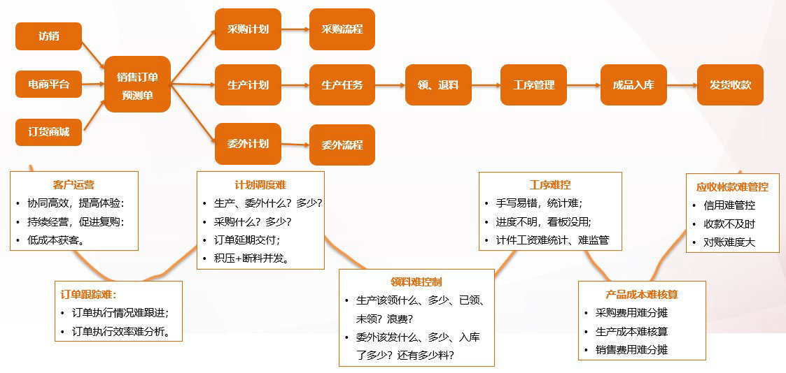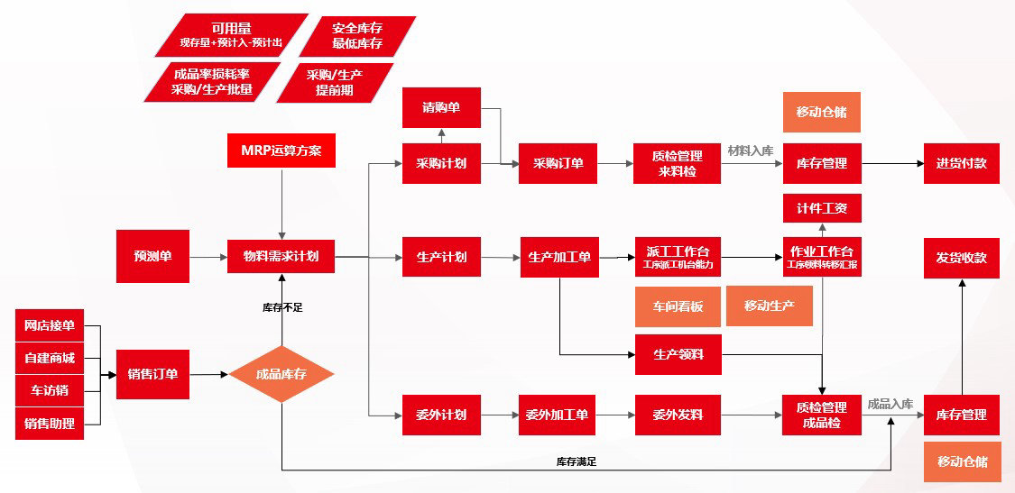 工贸企业大多由传统业务员车访销模式,过渡到自建商城营销、网店营销等多营销渠道并行模式,所以他们的业务多始于车访销、商城订单、网店订单,这些订单同步到ERP系统的销售订单,借助ERP系统判断库存,库存充足直接销售发货,进入收款流程。库存不足则需要进行物料需求分析,借助系统的智能计划来组织采购、生产和委外管理,控制物料合理性,实现可视化车间管理和准确的成本计算。