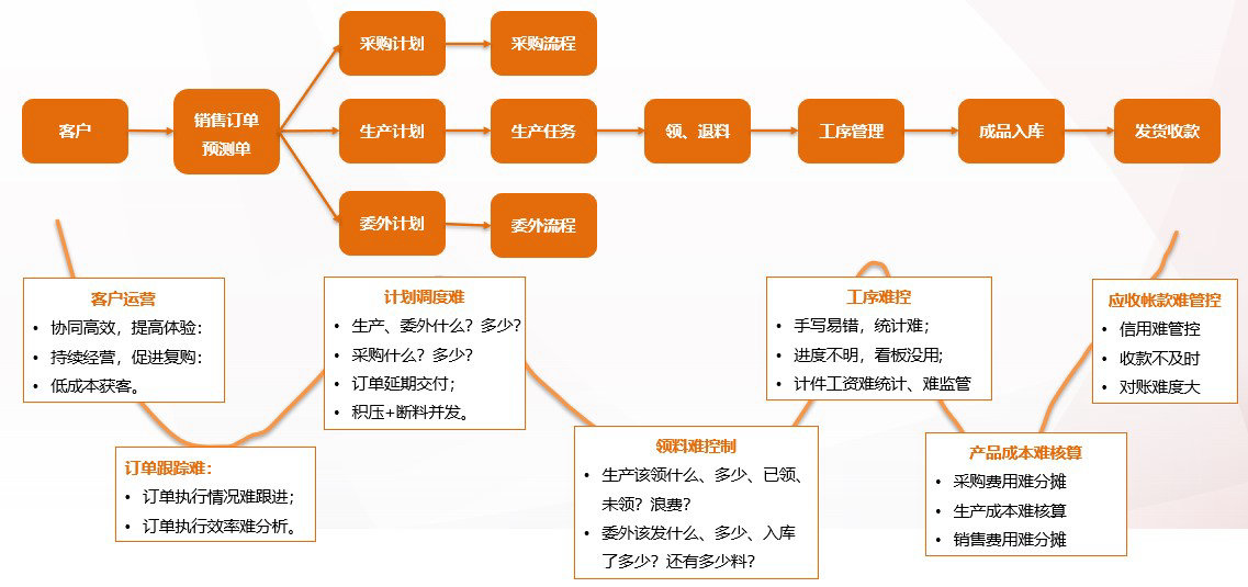 OEM/代工、配套类生产企业大多按照客户需求,进行产品设计,由设计人员维护BOM。企业需要根据销售订单、BOM及库存情况进行物料需求分析,借助系统的智能计划来组织采购、生产和委外管理,控制物料合理性,实现可视化车间管理和准确的成本计算。