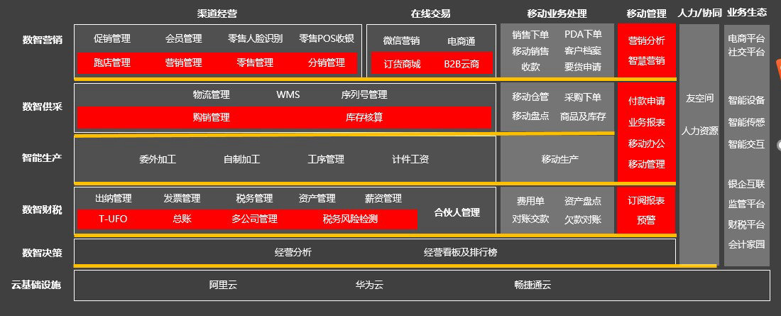 产品应用功能包括:经营管理(数据化经营分析、合伙人管理)、新零售(零售管理、促销管理、会员管理、电商通、微商城)、新商贸(营销管理、跑店管理、车/访销)、智能供应链(采购管理、销售管理、库存核算、物流管理)、新生产(生产管理、委外管理、工序管理、计件工资、物料需求计划)、新财税(发票管理、税务管理、往来现金、出纳管理、薪资管理、固定资产、总账、T-UFO、多公司管理);主要应用于中小型全渠道经营的商贸企业、工业企业与工贸企业一体化管理。