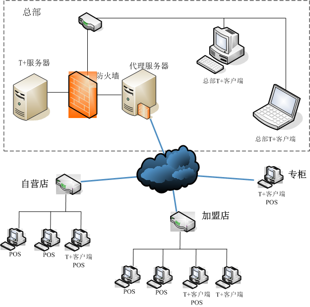 系统分连锁总部后台端、门店POS端两层管理,采用B/S结构。