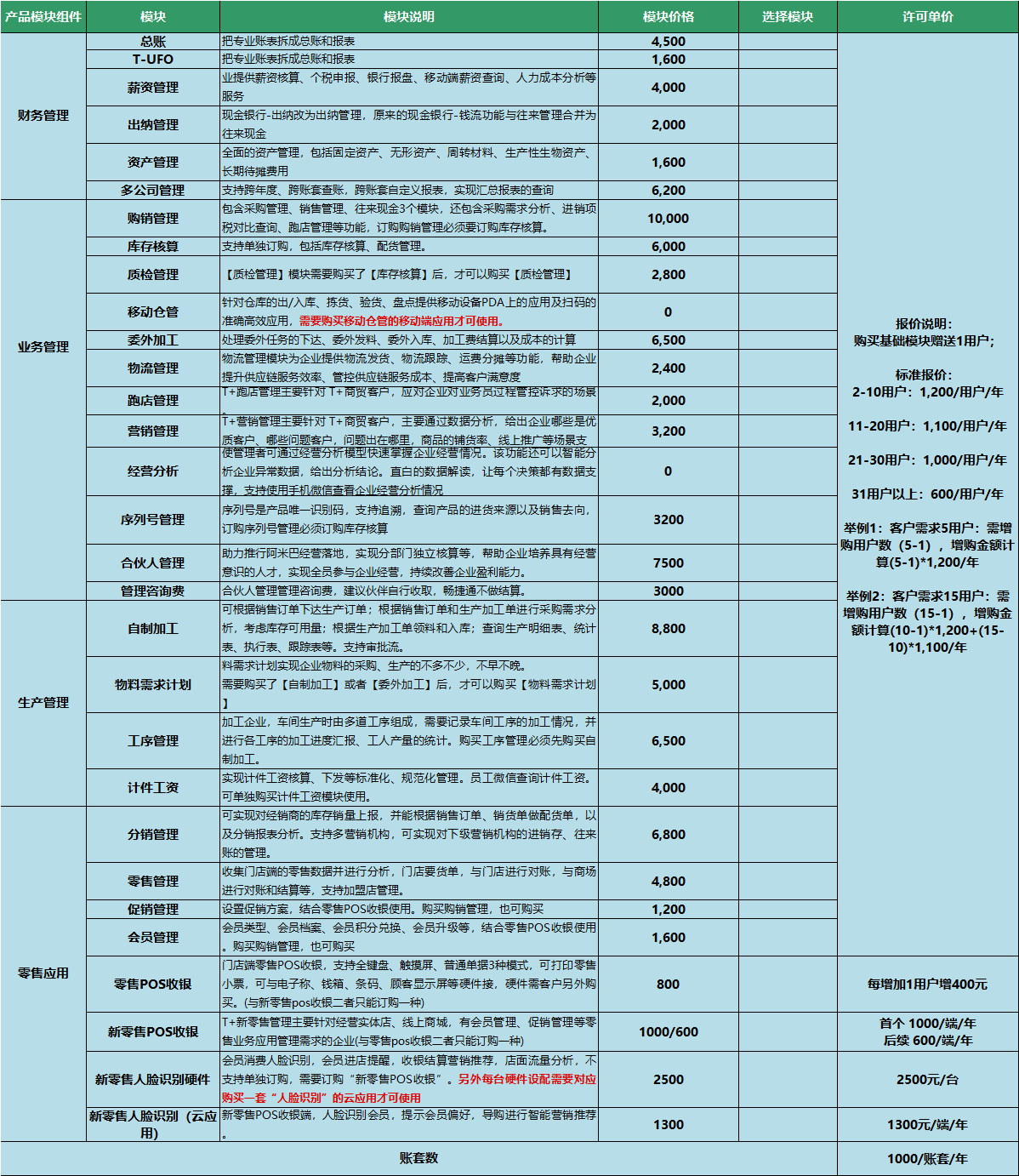 综上,购买一套软件的价格,就是模块站点的价格,加上实施费用啦。以下是用友畅捷通T+CLOUD的标准版的官网标准价格供参考。实际成交价格欢迎来电申请最优惠价格。
