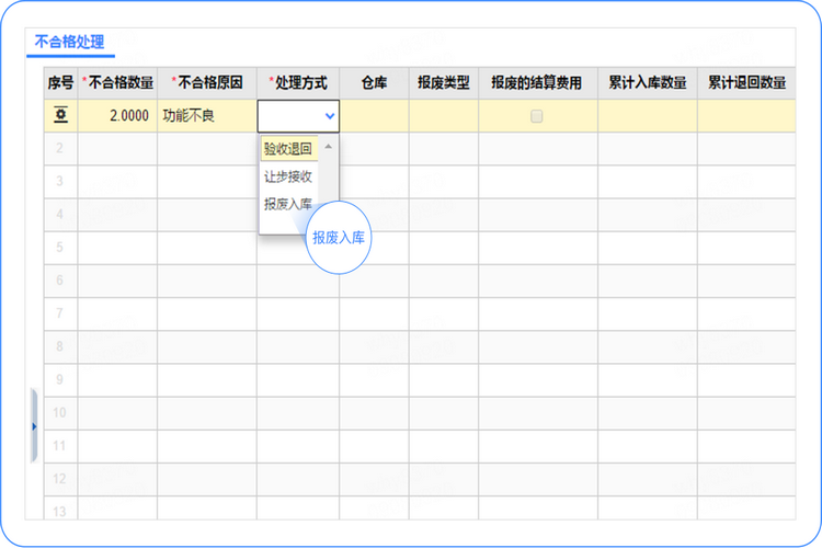 检验时,不合格的产品或材料处理方式支持报废入库,报废入库的商品可以进行后续入库的处理