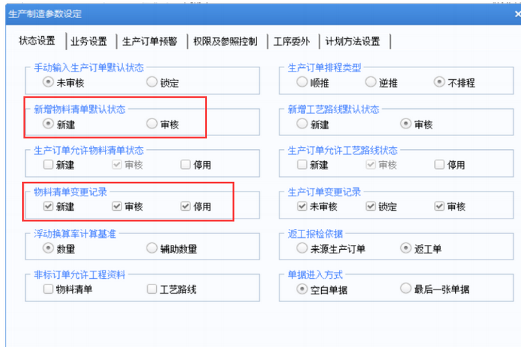 生产制造参数设定中设置物料清单部 分参数设置,具体如下: