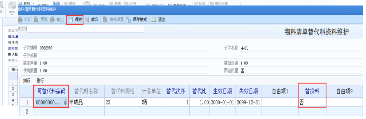 2、设置了替代料会有替代标识,没有替换日期,在替代料维护界面,替换料要选择否。