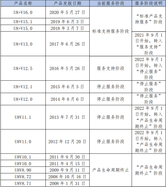 二、2021 年 U8+产品各版本服务生命周期表