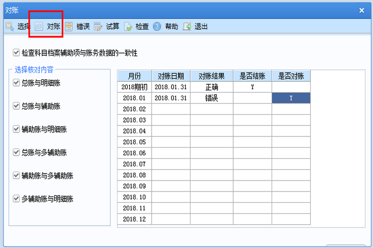 4、数据调整完毕,在进行记账,然后进行对账校验数据,逐月依次操作。