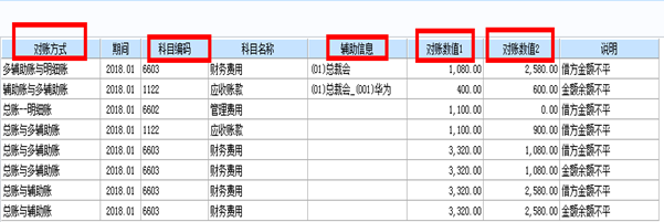 注意:“对账方式”描述属于哪一类对账错误;“期间”表示当前存在错误的会计期间;“科目编码”标着当