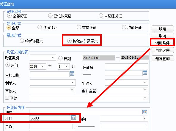 例子中,核查错误数据信息,在查询凭证-按凭证分录展示,选科目“6603”,检查“错误月份”凭证