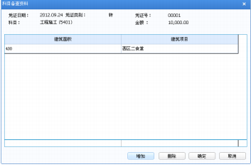 如果该科目已指定备查科目项,则点击〖备查〗按钮,可输入该科目的备查资料, 如图 5-9,点击〖增加〗按钮,可增加一空行,输入相关备查内容。