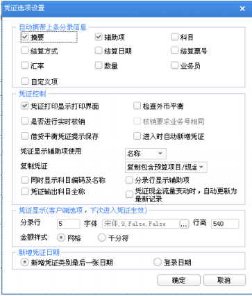 凭证显示客户端选项、下次进入凭证生效:包括分录行、行高、字体。此功能 是在凭证显示时,用户可以设置显示的分录行数、行高及字体。金额样式支持 选择网格或者千分符型。该设置为客户端选项,有多个用户使用多个客户端时, 按照每个用户自己的客户端设置显示凭证。修改了该选项后,凭证显示不立即 修改,下次进入凭证时生效。