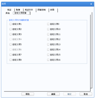 如果系统提供的个人、部门、项目、供应商、客户等辅助核算项不够时,可在此将 某些自定义项设置为辅助核算。可对设置为辅助项的自定义项录入期初、期末结转、 多辅助账查询。其余没有设置为辅助项的自定义项,如果在科目表中选中了,那么 只在凭证中作为备注项录入,查询多辅助账时只能作为栏目项显示,不提供小计。
