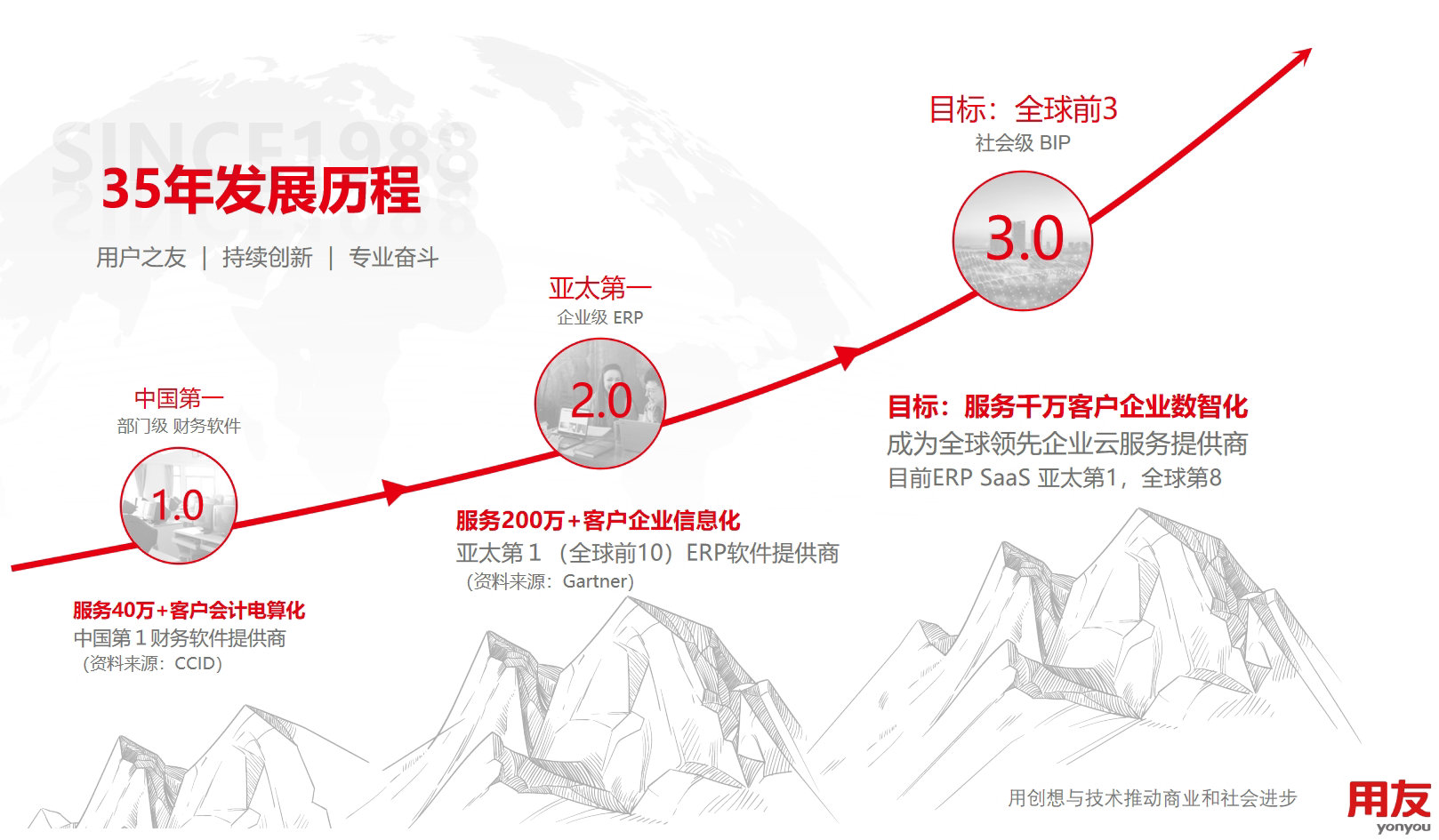 目前,用友正处于3.0发展阶段,致力于推广全球领先的数智商业创新平台——用友BIP,目标是服务超过千万家企业的数智化转型,并成为全球领先(前3名)的企业云服务和软件供应商。