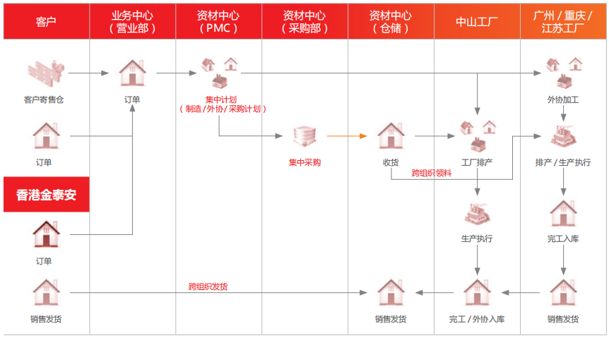 • 集中接单后,由中山 PMC 统一安排生产计划;广州 / 重庆 / 江苏作为中山的委外单位,接单生产。