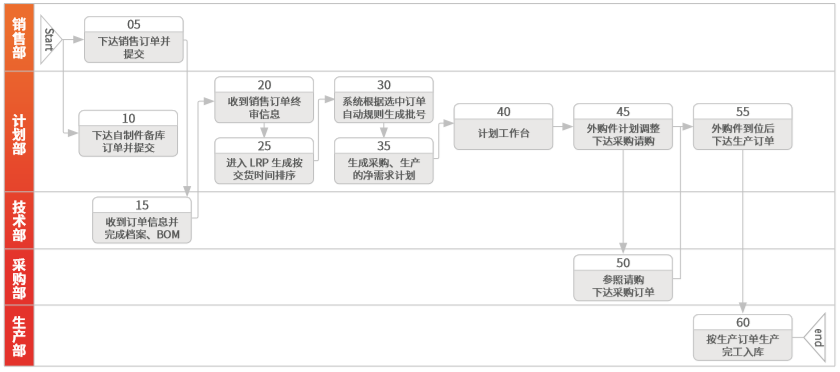 • 预测订单执行LRP计划,实现半成品、物料的备货生产和采购计划。