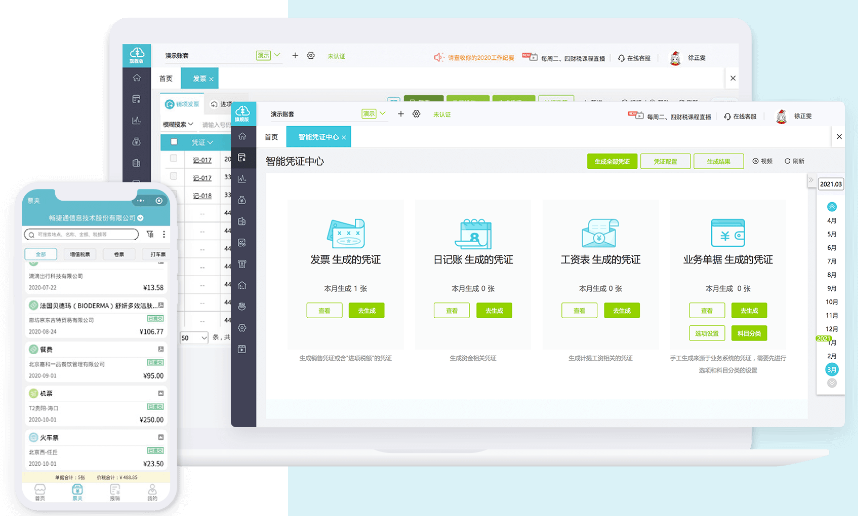 帮助财务人员通过 PC 端、手机端、微信端随时随地管理现金银行、发票、往来、报税、经营分析等,高效、智能提升小微企业财务管理水平。